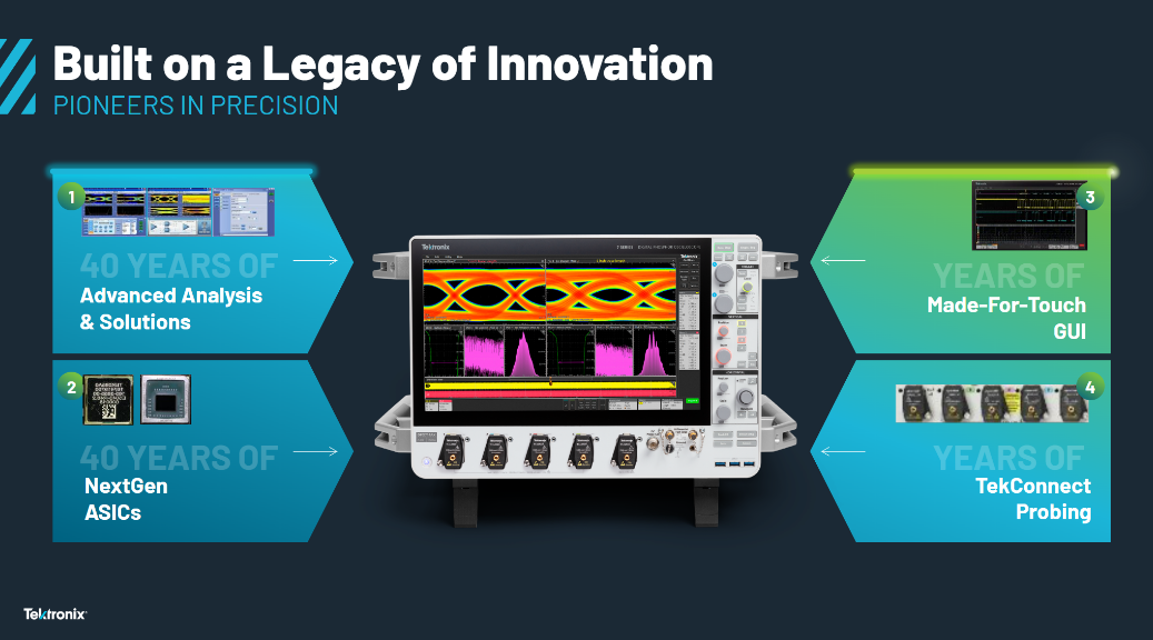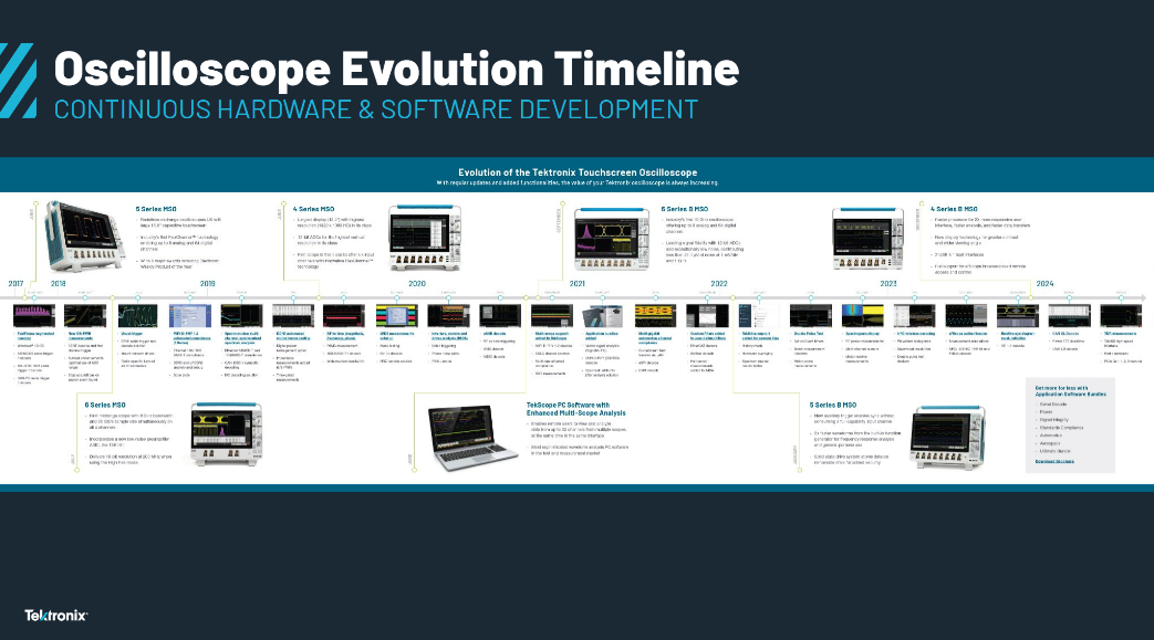 进入数字时代,泰克于1998年推出革命性的数字荧光示波器(DPO),以三维波形显示技术重现了模拟示波器的辉度特性,加速了数字技术对模拟示波器的全面替代。21世纪以来,泰克持续突破性能极限,先后推出首台20GHz实时示波器(2007年)和70GHz ATI高性能示波器(2015年),同时开创混合域示波器等新品类。近80年的技术积淀,使泰克始终引领行业创新,为全球工程师提供突破边界的测量利器。.png)