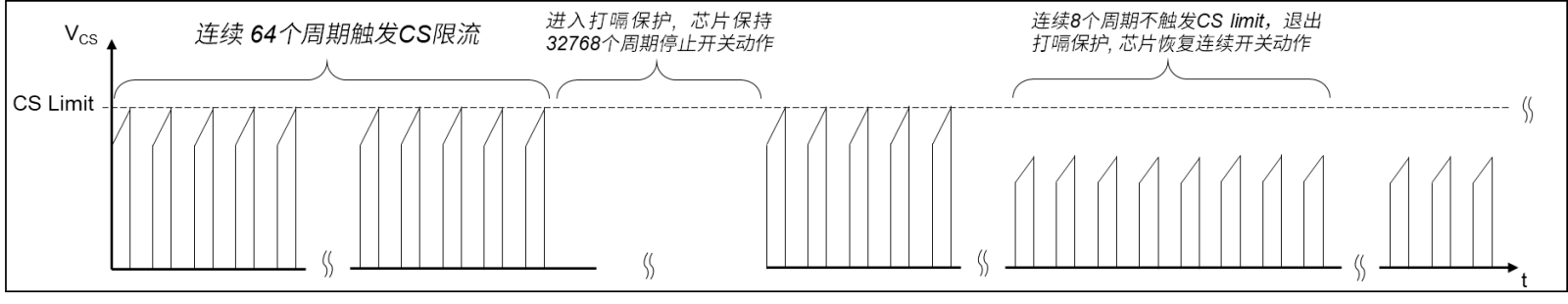• 触发条件:当连续64个开关周期检测到CS限流则会触发打嗝(Hiccup)保护,芯片保持32768个周期停止开关动作;当触发打嗝保护后,在不满足退出条件时,若累计有64个开关周期检测到CS限流,则仍会启动打嗝(Hiccup)保护。